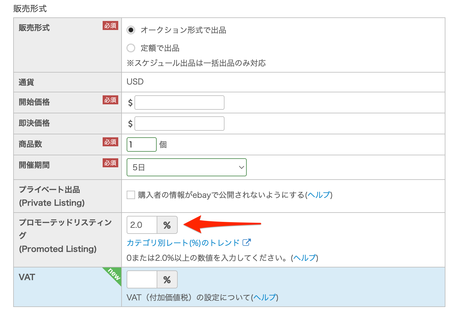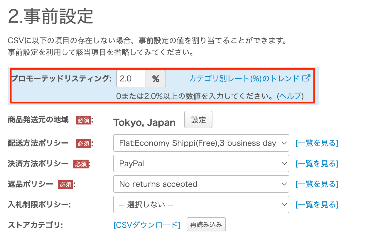 - プロモーテッドリスティングを設定しない場合は 0 を入力してください。