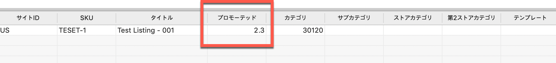 ① プロモーテッドリスティング値を2.0、10.0のような形式の数値を入力します。